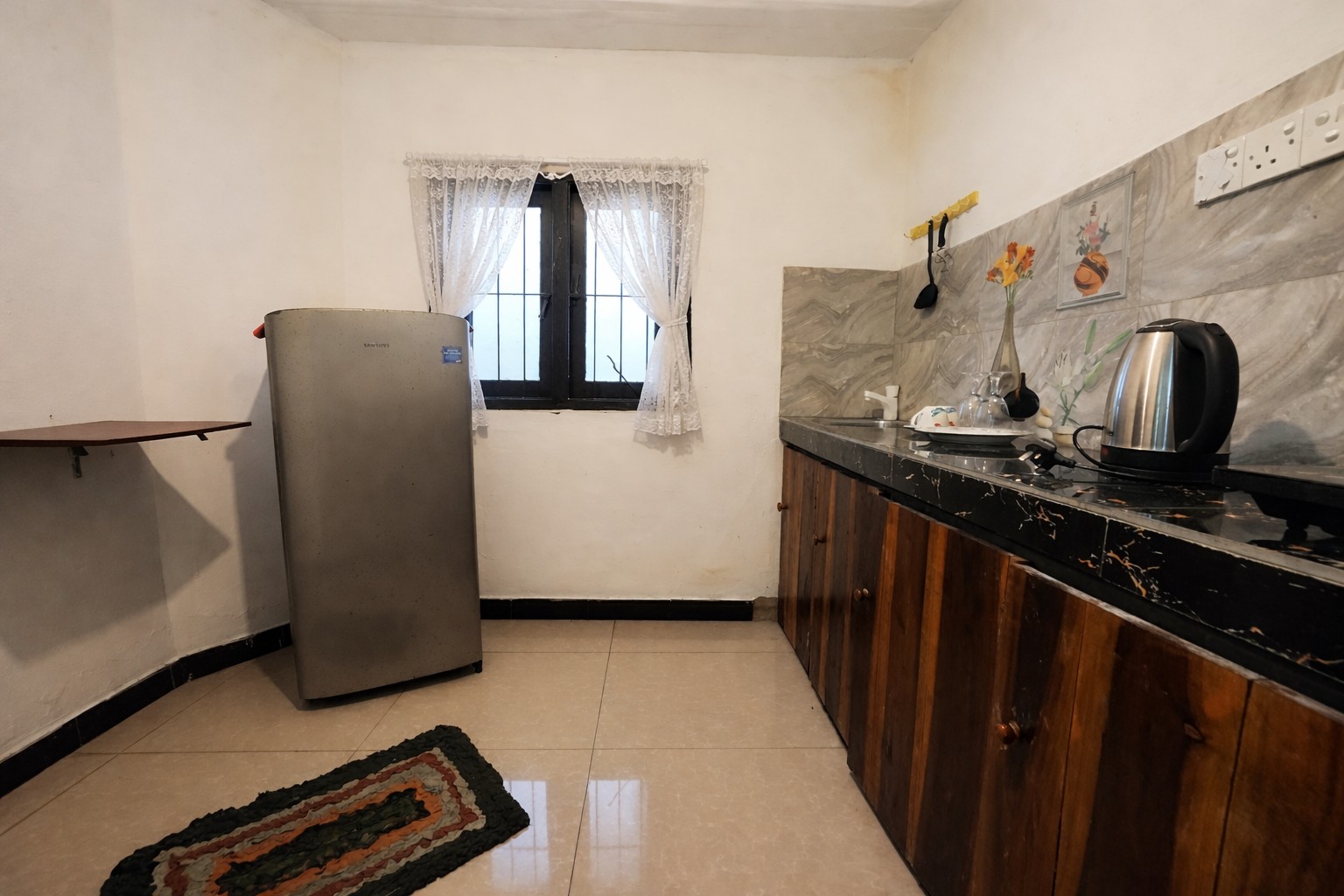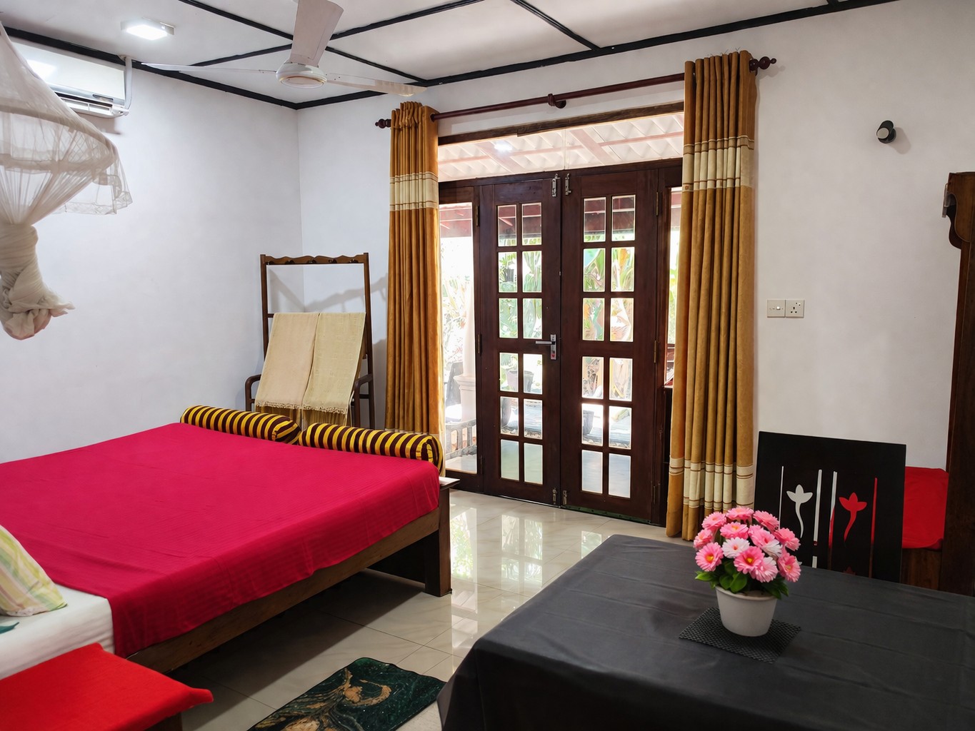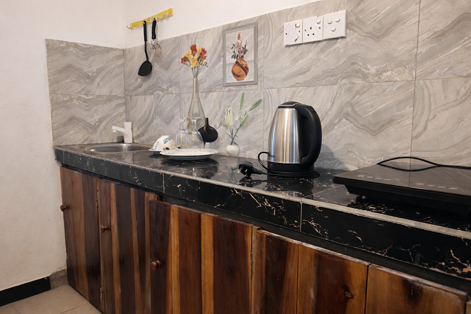 A special feature of this room is its own fully equipped kitchenette with a dining area, refrigerator, microwave, toaster, and kettle. The modern en-suite bathroom comes with everything you need, including a bidet, soft bathrobes, and free toiletries. For your convenience, there is an outdoor seating area by the entrance with outdoor furniture to enjoy the fresh air, and the windows are fitted with mosquito nets.